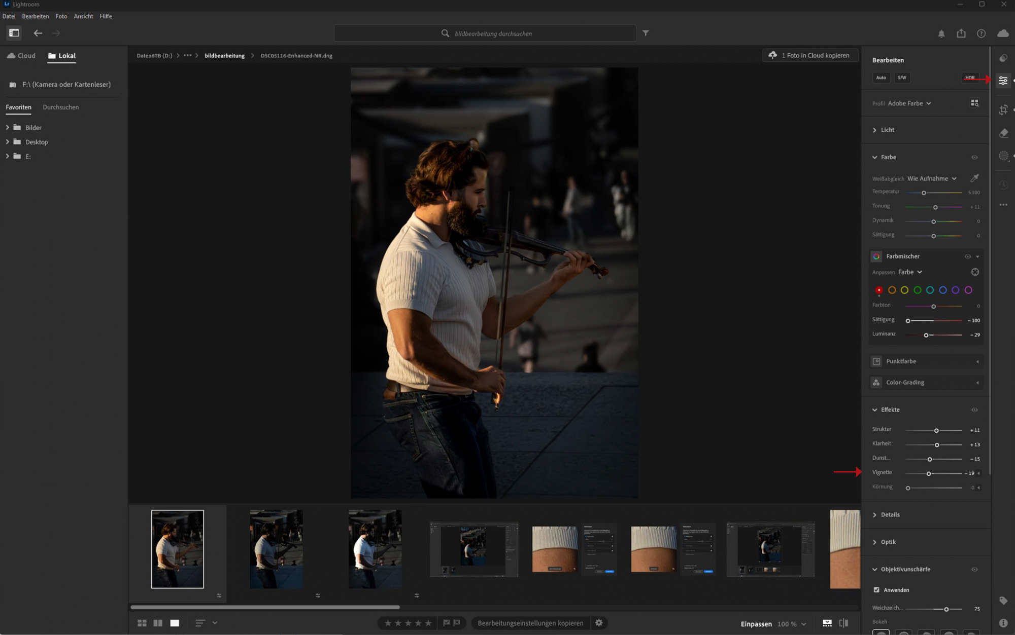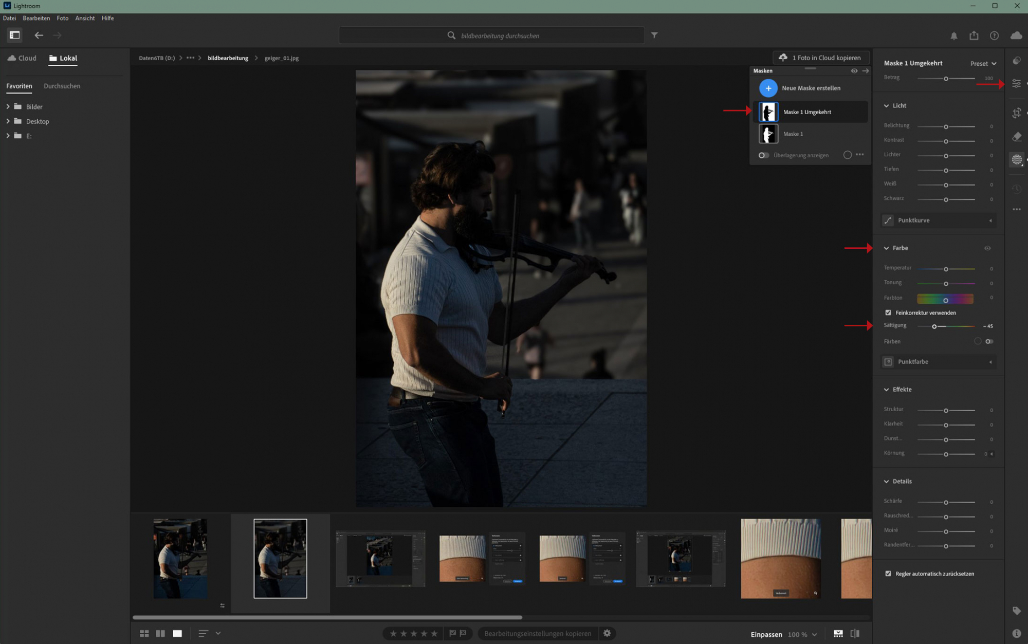 Ich bleibe in der Maskierungsauswahl und wähle nun unter „Farbe“ -> „Sättigung“ einen niedrigeren Wert. Damit wird der Hintergrund farbloser und der Geiger selbst steht als Motiv noch weiter im Vordergrund.