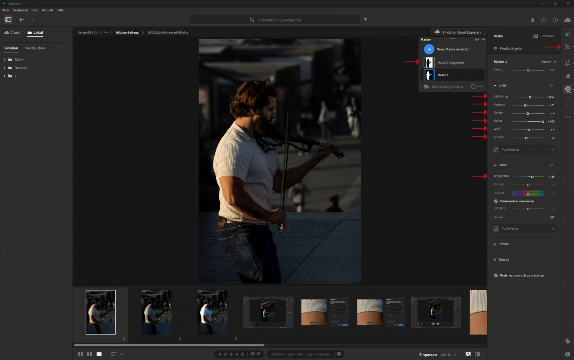 Nun möchte ich die Belichtung des Geigers ändern. Dazu wähle ich die Maskierung des Motives aus und stelle unter „Licht“ eine bessere Beleuchtung ein. Wichtig ist vorallem, die Tiefen zu maximieren. Damit der schattige Bereich deutlich aufgehellt wird. Mit „Lichter“ und „Weiß“ sollte man vorsichtig sein, um nicht die Weißbereiche auszubrennen.