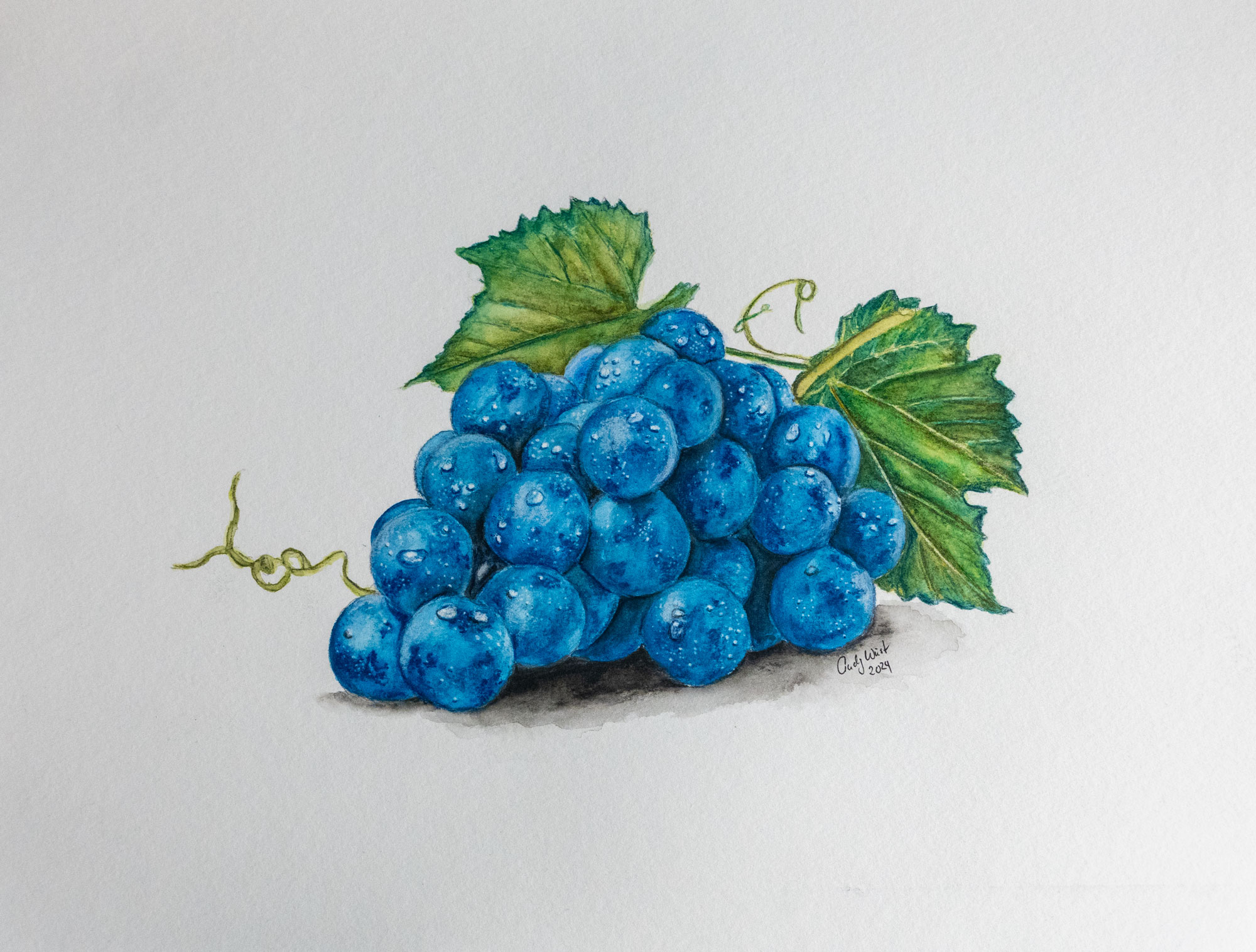 Frisch und knackig. Blaue Weintrauben mit Wassertropfen – direkt wie frisch gepflückt. Diese leckeren blauen Weintrauben entstanden Schicht für Schicht mit Aquarellbuntstiften, die anschließend mit Wasser vermalt wurden. So entsteht ein wunderbarer Aquarell-Effekt.